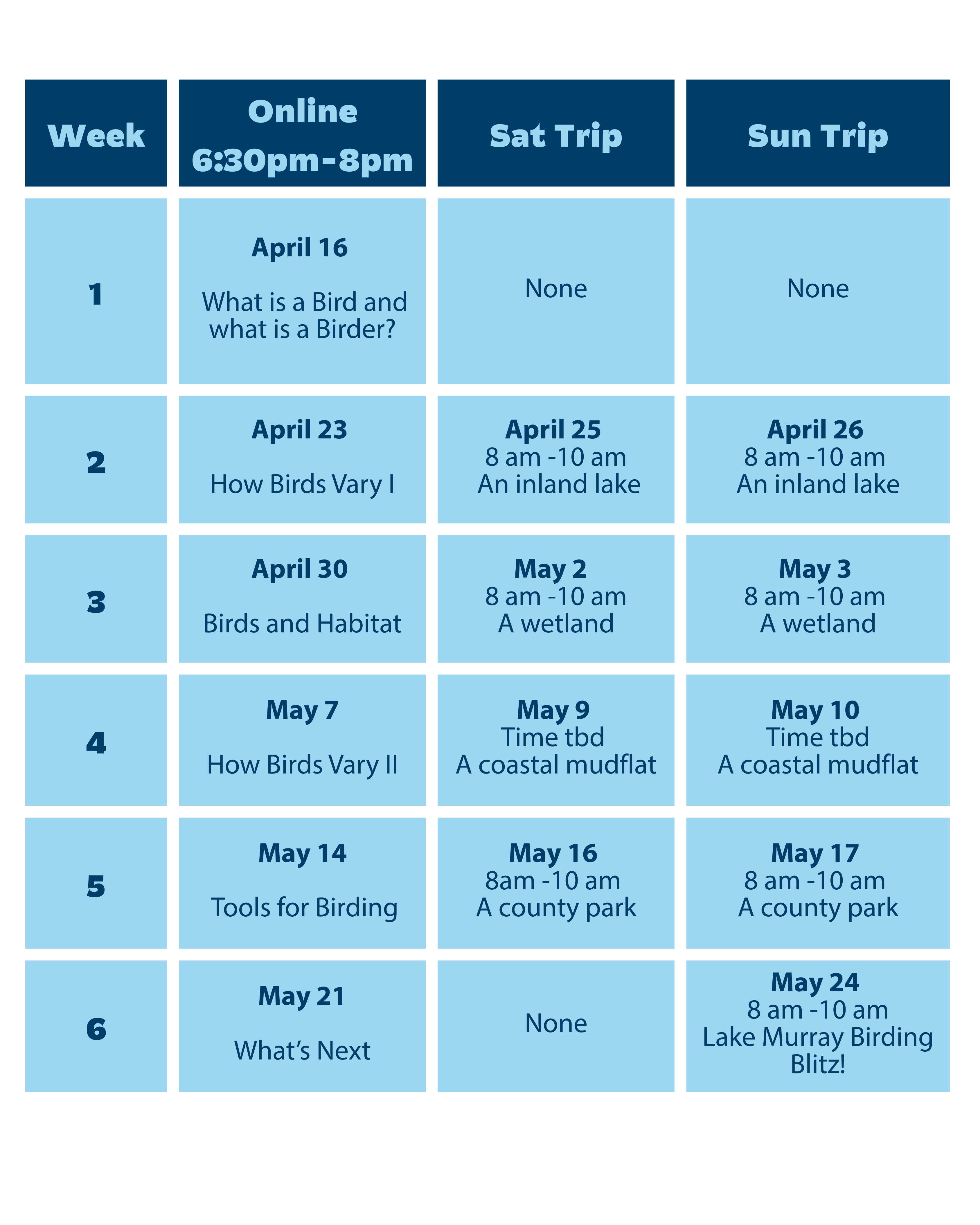 6 May 21 None May 24 What’s next and Birding Blitz
