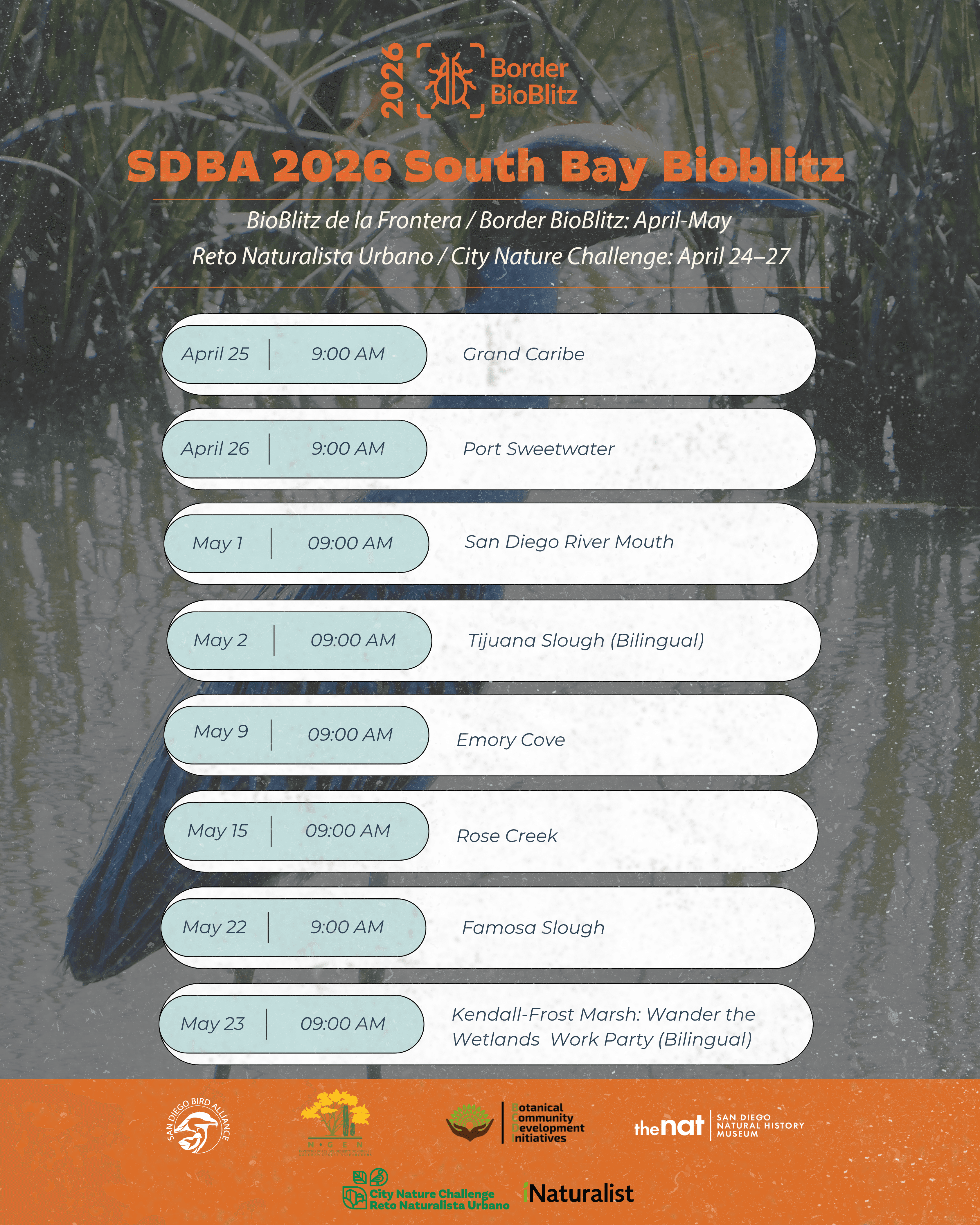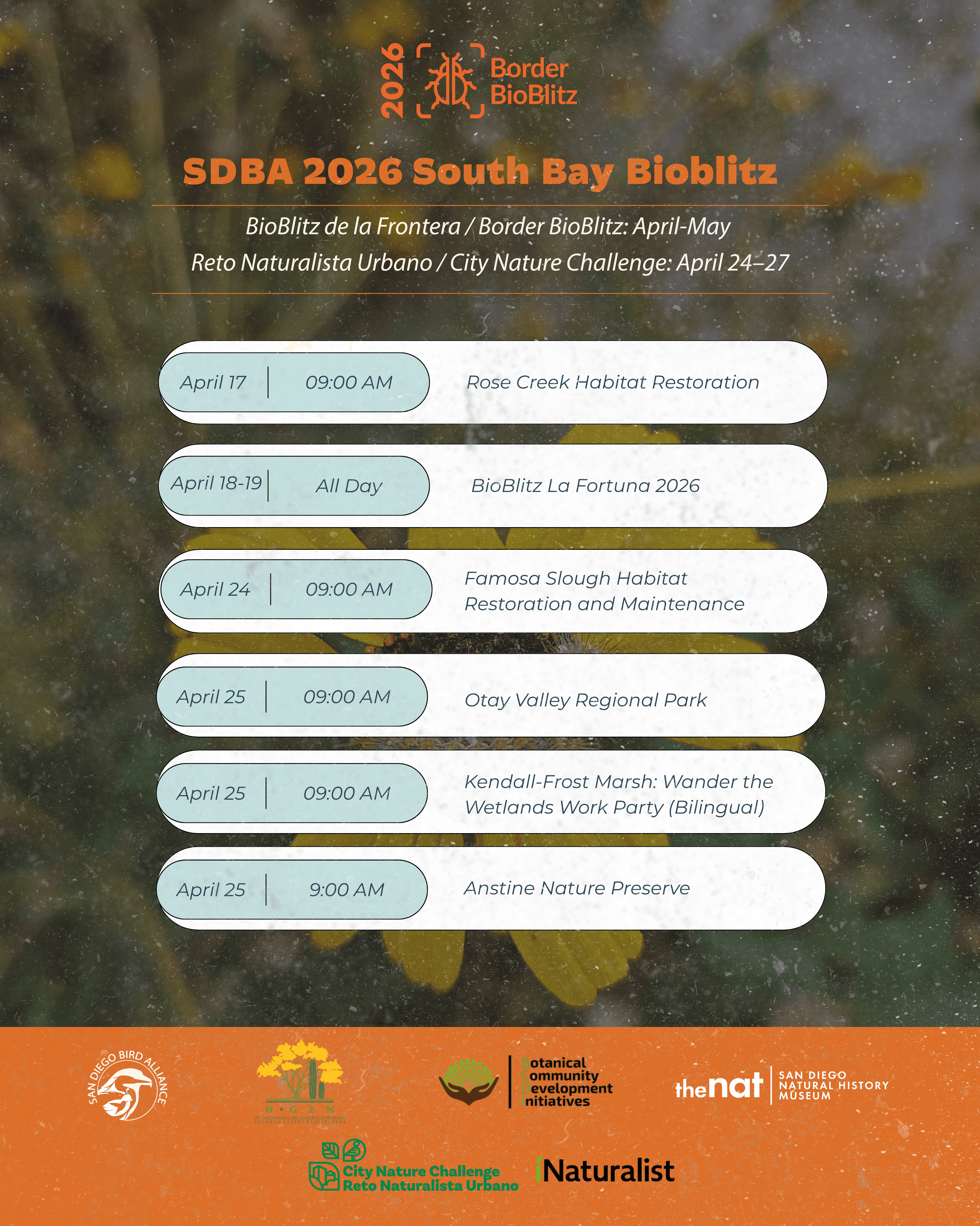 Join the San Diego Bird Alliance (SDBA) for the annual City Nature Challenge and Border BioBlitz | Únete a San Diego Bird Alliance (SDBA) para el Reto Naturalista Urbano y el BioBlitz de la Frontera