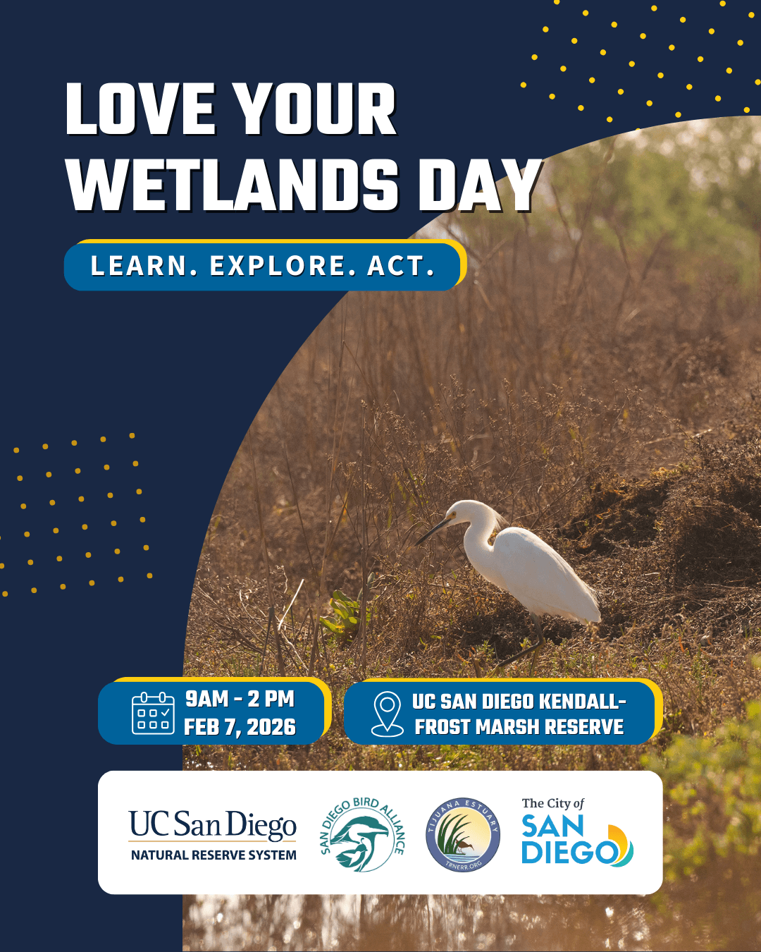 El Día de Amar tus Humedales es una oportunidad para explorar la Reserva Protegida Kendall-Frost Marsh de UC San Diego, ubicada en Mission Bay, mientras aprendes sobre la importancia de los humedales costeros, las amenazas climáticas que enfrentan y las formas en que las comunidades locales están trabajando para restaurarlos y protegerlos.