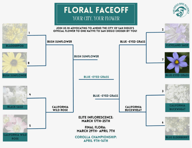 On Earth Day, April 22nd 2025, we brought Blue-Eyed Grass to City Hall, where the San Diego City Council unanimously passed a resolution replacing the non-native carnation with the people’s choice. Now, we want to see commitment from the city to plant more natives! Ask your public representatives & park rangers to plant more Blue-eyed Grass, and other incredible flowers from the bracket of worthy contenders that support pollinators, improve habitat and have cultural significance. Meet the Contenders