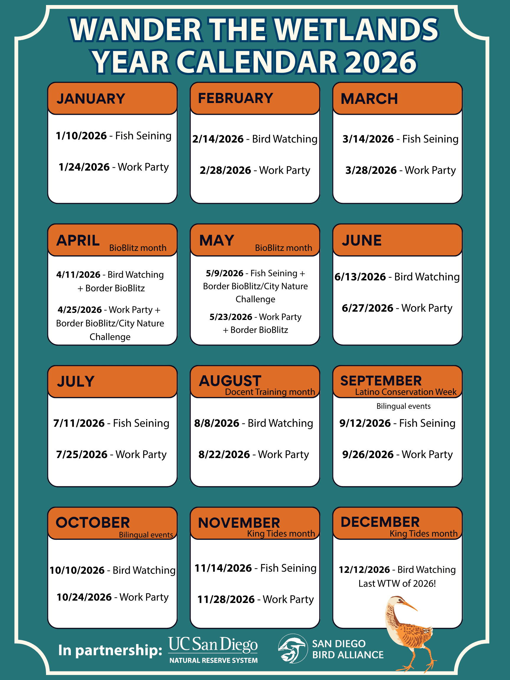 If you are interested in collaborating on a Wander the Wetlands Event, please email our Community Science Coordinator at kornelas@sandiegobirdalliance.org to get more involved.